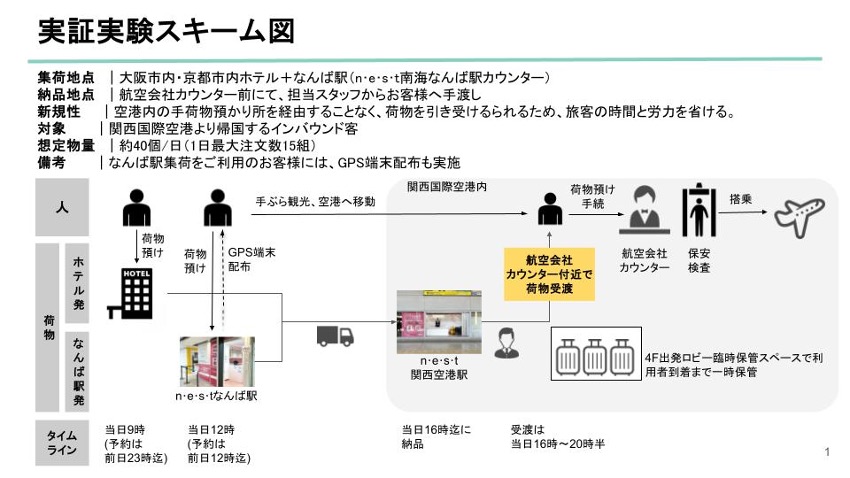 実施内容:大阪・京都の一部対象ホテルや、難波駅から関西国際空港への手荷物配送サービスを提供し、利用者の声(課題や改善点、インタウンチェックインに関する需要)を収集